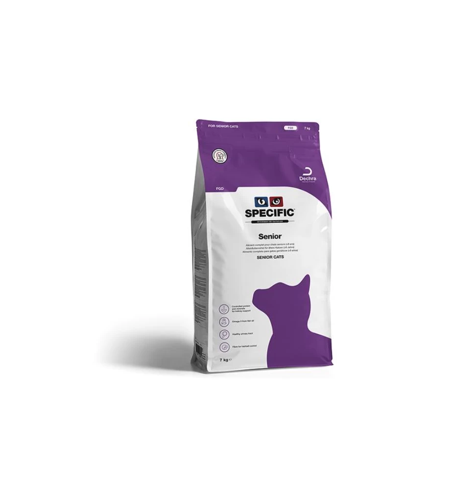 Specific Senior FGD is een complete en uitgebalanceerde onderhoudsvoeding voor oudere katten. Het bevat voedingsstoffen die de hartfunctie, leverfunctie, nierfunctie en de gewrichten ondersteunen. De toegevoegde Omega-3 vetzuren zorgen voor een gezonde vacht en huid en ook voor soepele gewrichten.