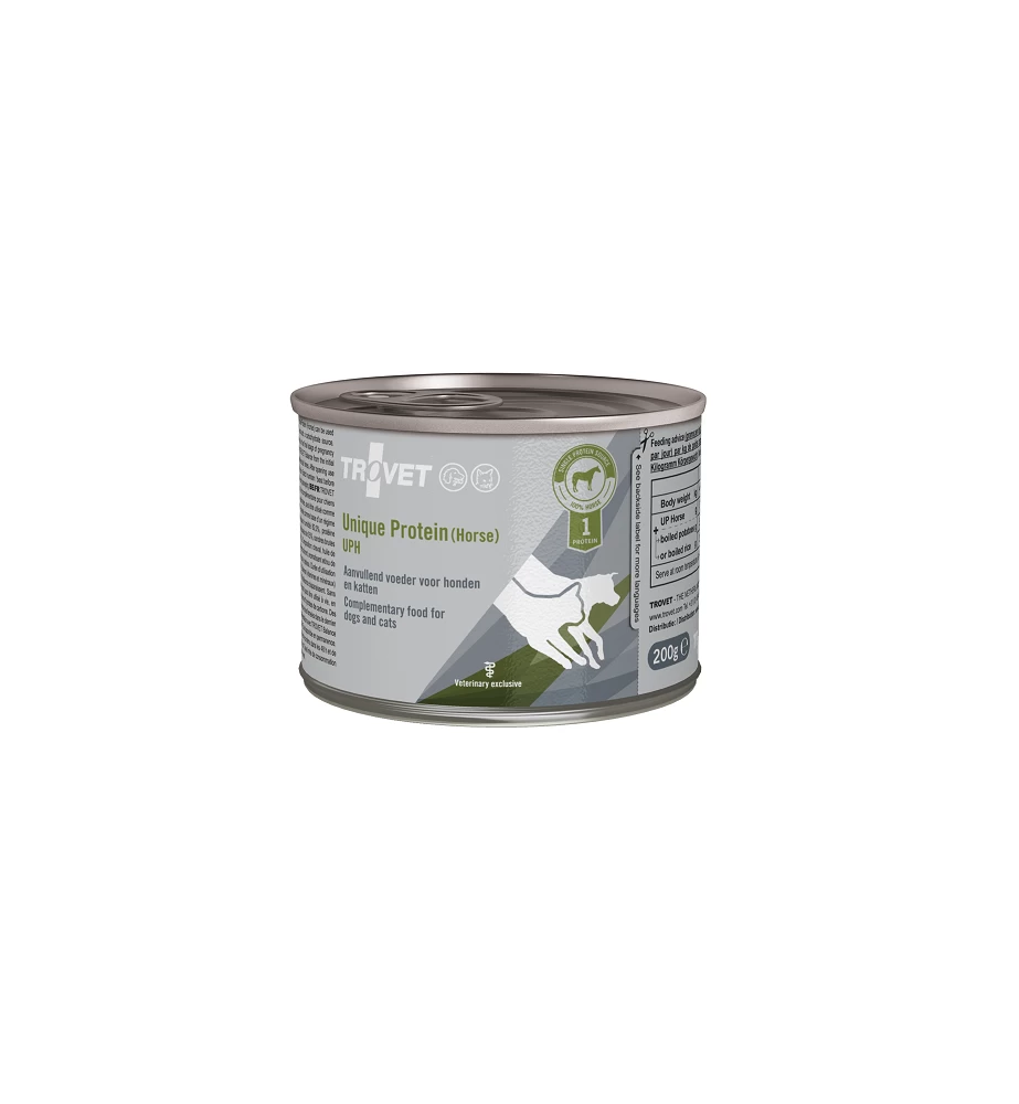 De Trovet Unique Protein voedingen zijn in te zetten bij dieren met een voedingsallergie of -overgevoeligheid. Ze bevatten 100 % vlees van een dierlijke eiwitbron en zijn bedoelt voor het zelf bereiden van een eliminatiedieet voor uw hond of kat. Meestal zijn de bijzondere dierlijke eiwitten die de dierenarts voorschrijft moeilijk verkrijgbaar en is afwegen en bereiden van de voeding een tijdrovende bezigheid. Daarnaast verspreiden sommige vleessoorten een onaangename geur tijdens de bereiding. Om een eliminatiedieet samen te stellen hoeft u alleen een koolhydraatbron te koken en de Trovet Unique Protein toe te voegen. De voorkeur gaat uit naar witte rijst of aardappel.